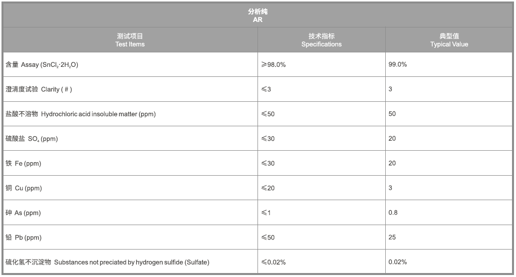 Application:It is used in such industries as dye, perfume, mirror making and tinplate; it is used for alkaline tin electroplating and electroless tin plating as well as electroplating of such alloys as copper-tin, copper-zinc-tin and nickel-tin alloys; in non-metal electroless plating process, it is used for preparing palladium activating solution.