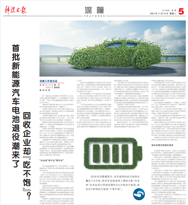 11月18日,为进一步加强锂离子电池行业管理,推动行业转型升级和技术进步,工信部修订了《锂离子电池行业规范条件(2021年本)》(征求意见稿),其中提出,鼓励企业在产品前端设计增加资源回收和综合利用,健全锂离子电池生产、销售、使用、回收、综合利用等全生命周期资源综合管理。而就11月16日和18日,中央媒体科技日报和国家级电视台CETV分别对新能量汽车电池回收做了专题报道,并都邀约采访了LOL押注正规APP旗下珠海中力新能量科技有限公司的常务副总经理郭文辉,一同关注了行业的规范化发展。