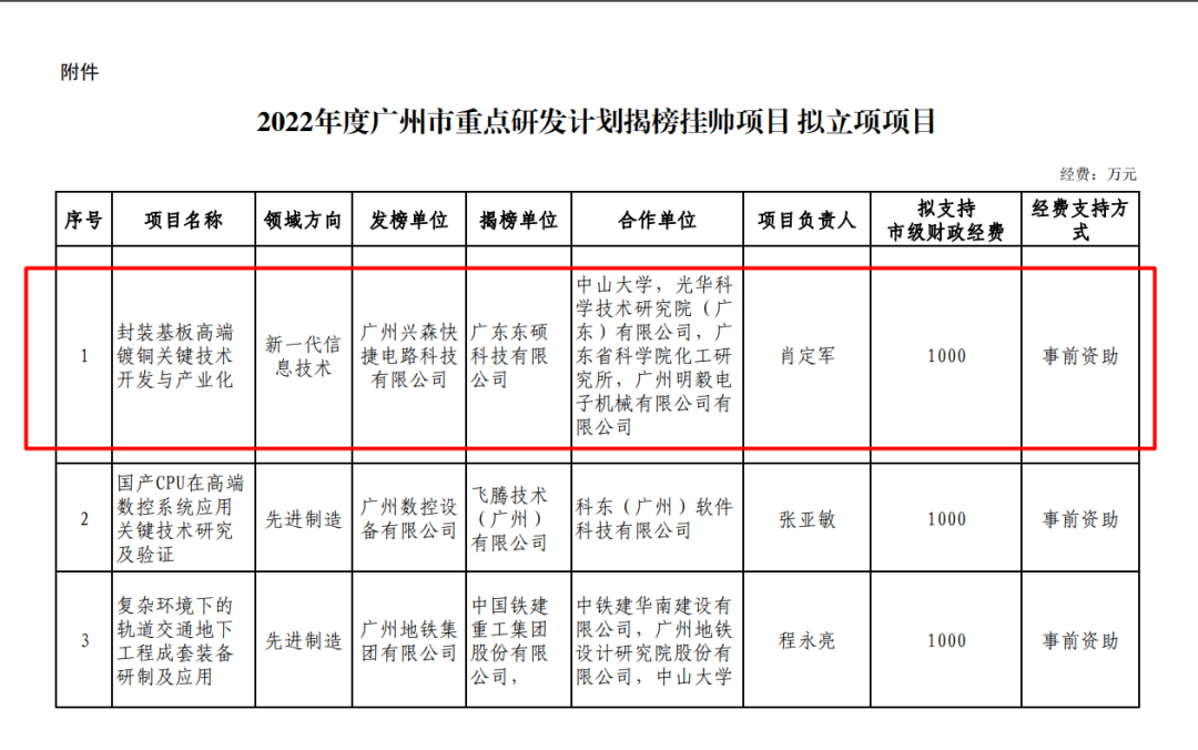 10月26日-11月1日,广州市科学技术局根据《广州市科技计划项目管理办法》(穗科规字〔2019〕3号)有关规定,对2022年度广州市三个重点研发计划揭榜挂帅项目拟立项项目进行了公示。其中,LOL押注正规APP旗下全资子公司东硕科技牵头,夺得“新一代信息技术”领域中的“封装基板高端镀铜关键技术开发与产业化”项目。该项目聚焦于封装基板的铜互联制程关键技术,目标开发出具有自主核心知识产权的封装基板酸铜电镀液,将有利于攻克基板产业供应链安全的“卡脖子”制约问题,打破国外垄断,进一步推动国内集成电路产业链的国产化和本土化进程,具有重大的国家战略意义。
