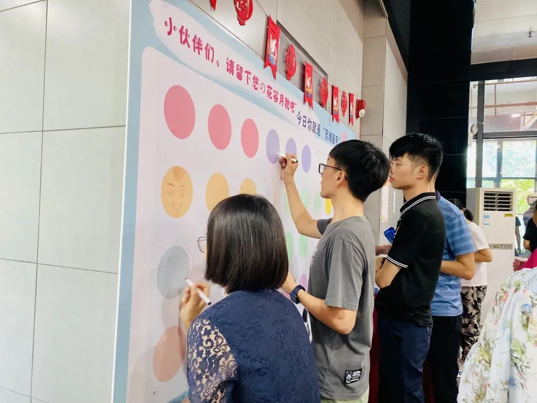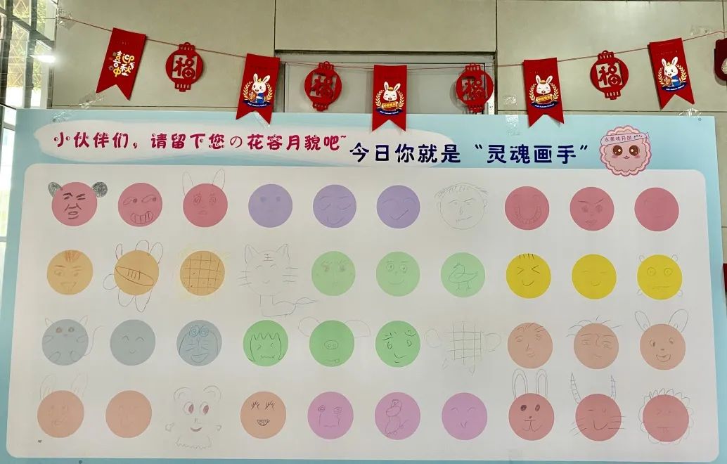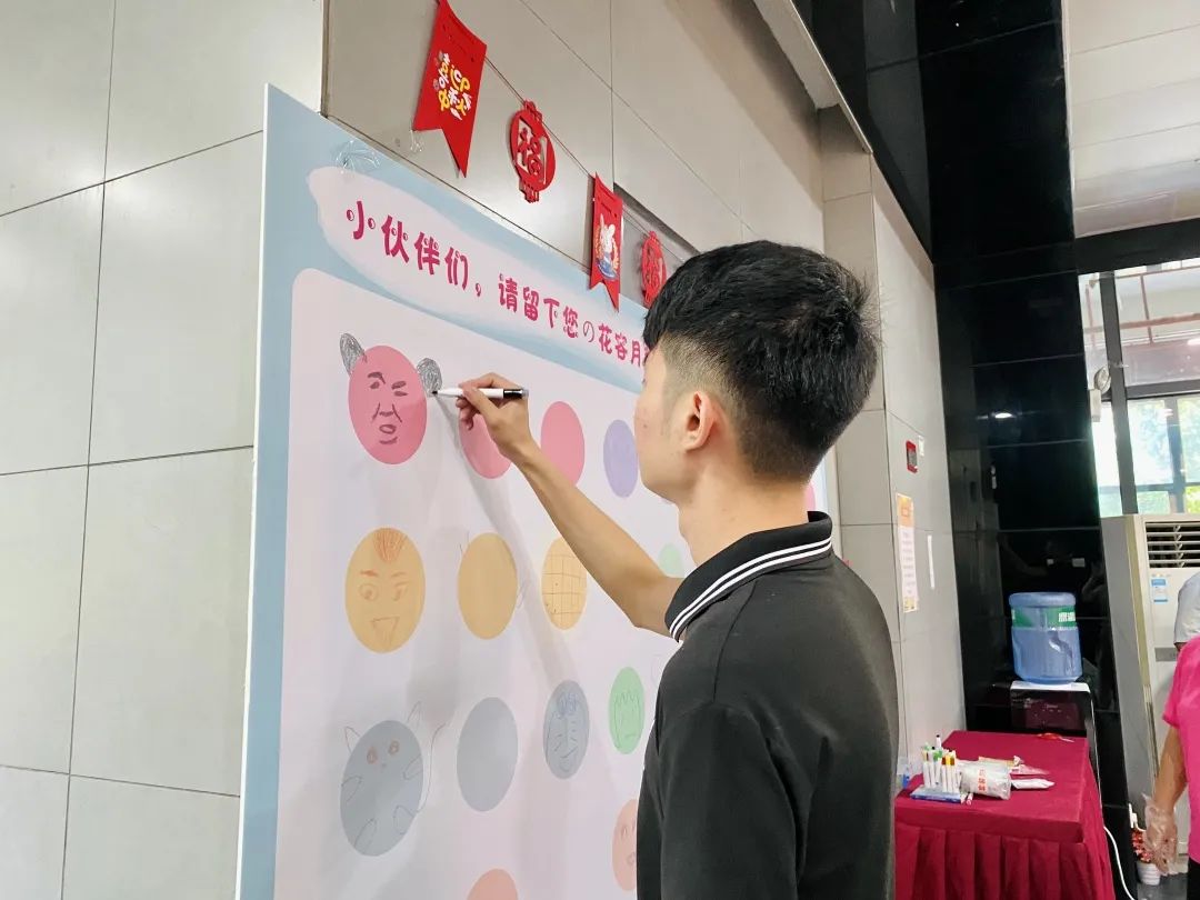 小伙伴们都在画板上自由发挥,有的画上了中秋元素图案,有的画上各种可爱的小动物,也有的画上网红小表情。大家一笔一划共同合作,形成了一幅很有爱的大画板~