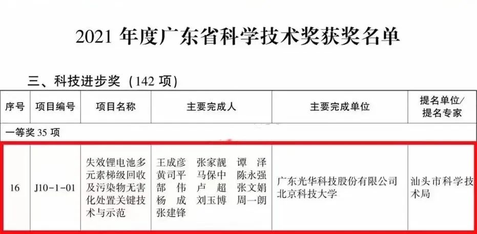 近日,2021年度广东省科学技术奖结果公布,广东科学技术奖是广东省在科技成果奖励方面的最高荣誉,其中由LOL押注正规APP、北京科技大学作为主要完成单位的《失效锂电池多元素梯级回收及污染物无害化处置关键技术与示范》项目成果在产业化应用过程中产生了显著的社会经济效益,总体技术居于国际领先水平,荣获了2021年度广东省科学技术奖进步奖一等奖。汕头新闻综合频道对此进行了独家报道,以下是详细内容。