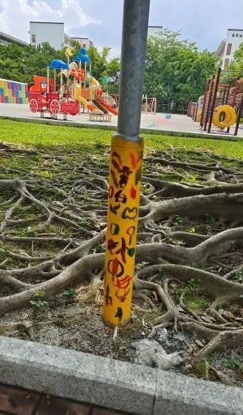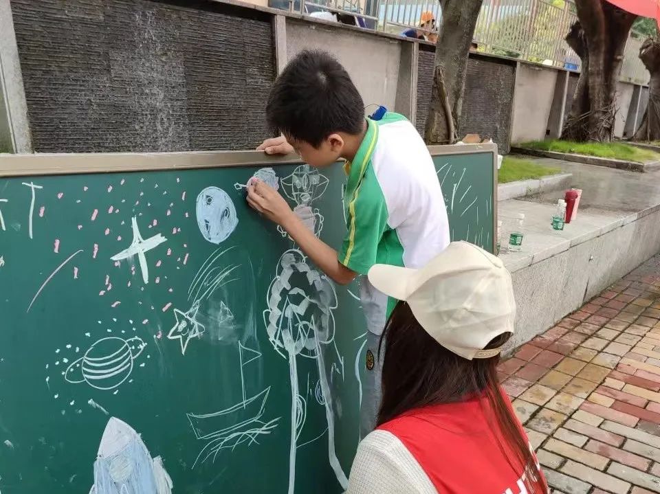原来孩子都是大自然原生的创作者,有着对美和自由表达的渴望。当天的涂鸦创作活动,吸引了近100名对绘画、涂鸦有浓厚兴趣的孩童参加。他们被分别安排到剪贴组、拓印组、绘画组、涂色组、粉笔涂鸦组,将在校园的篮球场看台、外墙面、培智大道灯柱及指定的黑板区域,展开涂鸦创作。