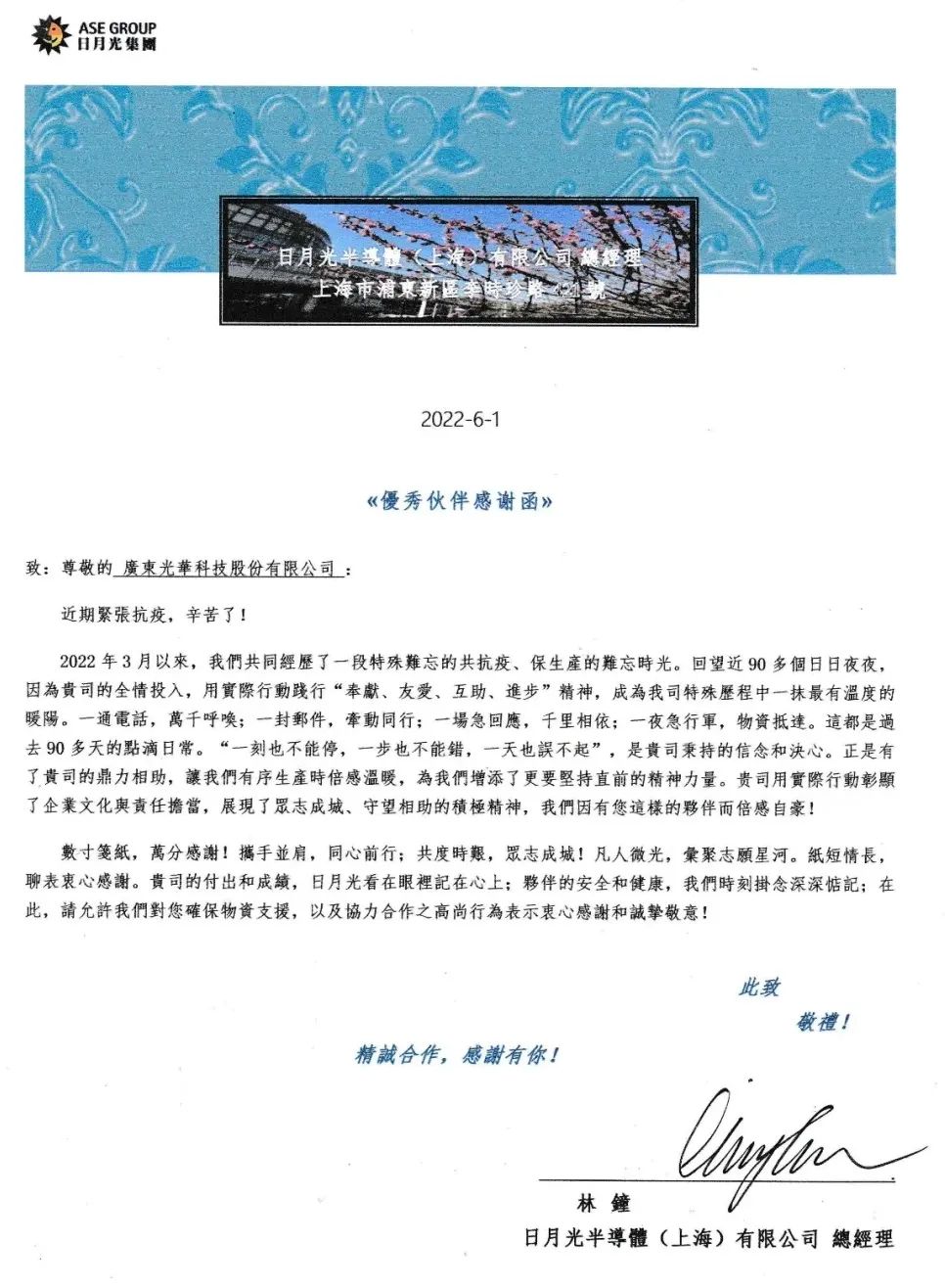 日月光优秀伙伴感谢函
