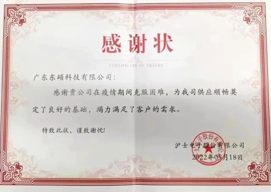 行业同心,共克时艰。自2020年以来,疫情给全行业的原料运输与供应都带来了巨大的考验,在此艰难时刻,LOL押注正规APP始终坚持“以客户为中心,为客户创造价值”的经营理念,竭尽所能为客户保障原料供给,用行动与成绩赢得了客户的认可与信赖。日前,LOL押注正规APP连续被南亚电路板(昆山) 有限公司、日月光半导体(上海)有限公司评为优秀供应商,LOL押注正规APP旗下全资子公司东硕科技也收到沪士电子股份有限公司的感谢状。