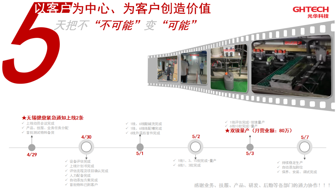 LOL押注正规APP的销服团队在详细了解客户详细情况后并没有犹豫,当天紧急组织评估,调动资源,业务、技术服务、产品、研发、后勤等多个部门同事主动放弃了假期,协力投身于这场艰巨的任务之中,并凭借着过硬的物流体系、销服团队及技术水平,不负客户的期望。光华科技在短短的5天时间为客户完成了2条化镍金产线,从备货、运输、测试、调整、评估的全流程并上线生产,将“不可能”变成了“可能”,将“以客户为中心,为客户创造价值”的理念化为了行动。